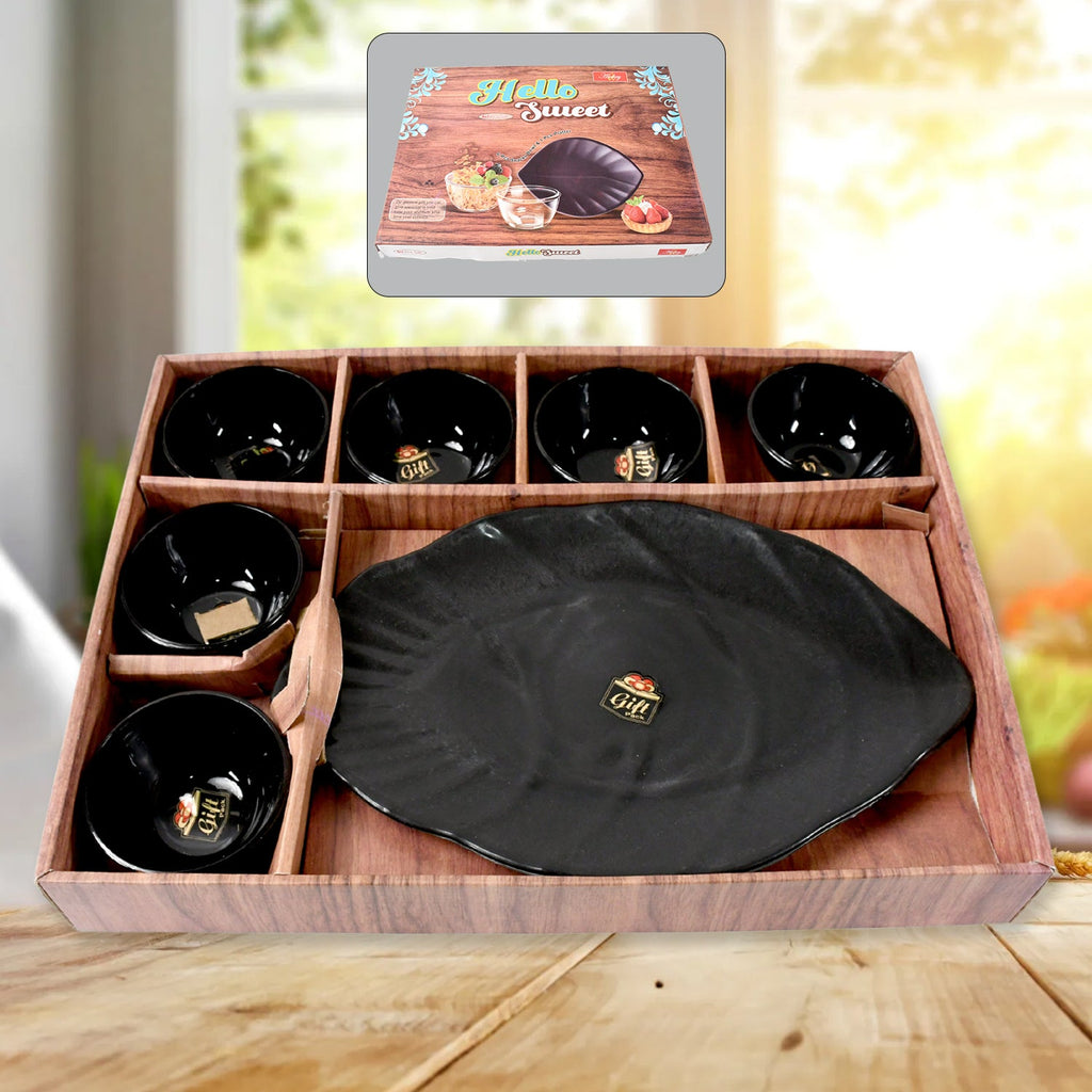 8236 Hello Sweet Round Ceramic Snacks Bowl With Plastic Leaf shape Serving platter Portable, Lightweight Breakfast, Serving Bowl | Ideal for Rice, Pasta, Desserts Home & Kitchen Serving Bowl & platter (7 Pcs set)